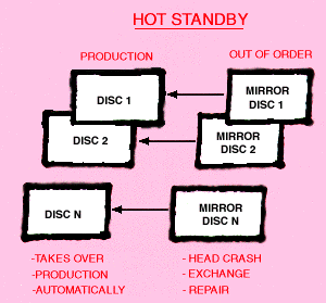 ![]() The Dual Disc Mirror operates independently of the application software. In the event of a head-crash on one of the disks of a pair, the other disk takes over operations. The defective disk itself can be replaced without loss of production. With minimal loss of production time during: